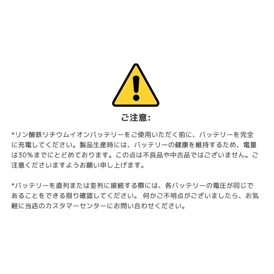 | 商品仕様 | サイズ:26cm*17cm*21cm 重量:約9kg 端子サイズ:M8 定格電圧12.8V 電力量:1280WH 充電電圧:14.6V±0.2 過充電遮断電圧:14.8V±0.2 BMS:4S120A サイクル数:3000回以上(100%のDOD) 充電電流定格値:50A 最大値:120A 放電電流連続値:100A |