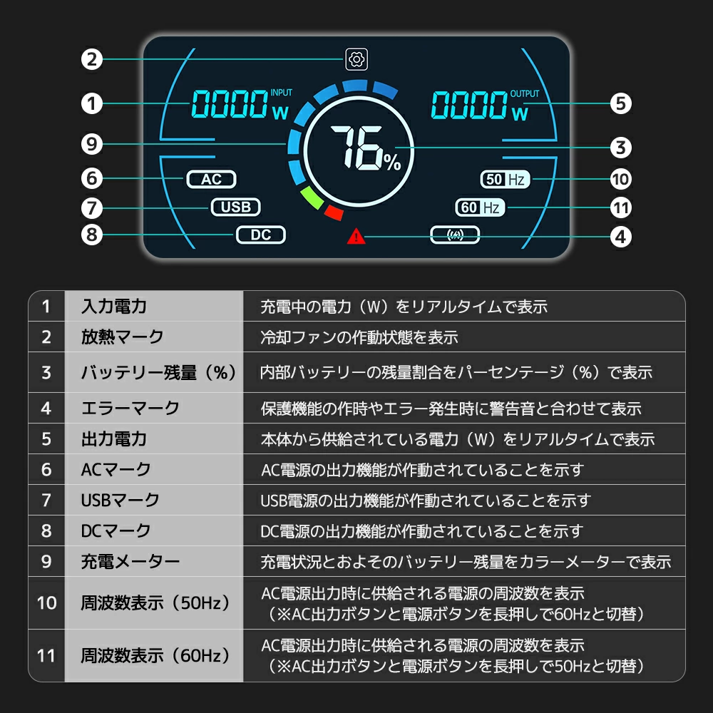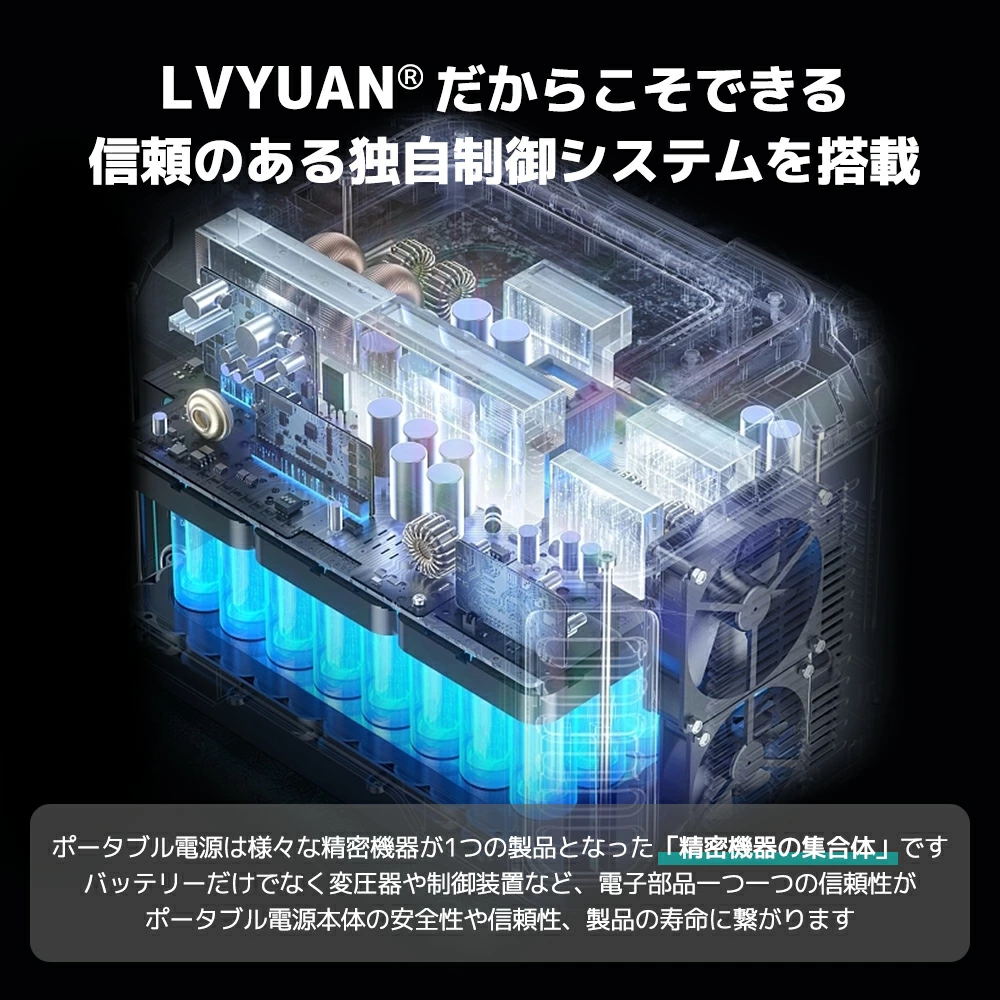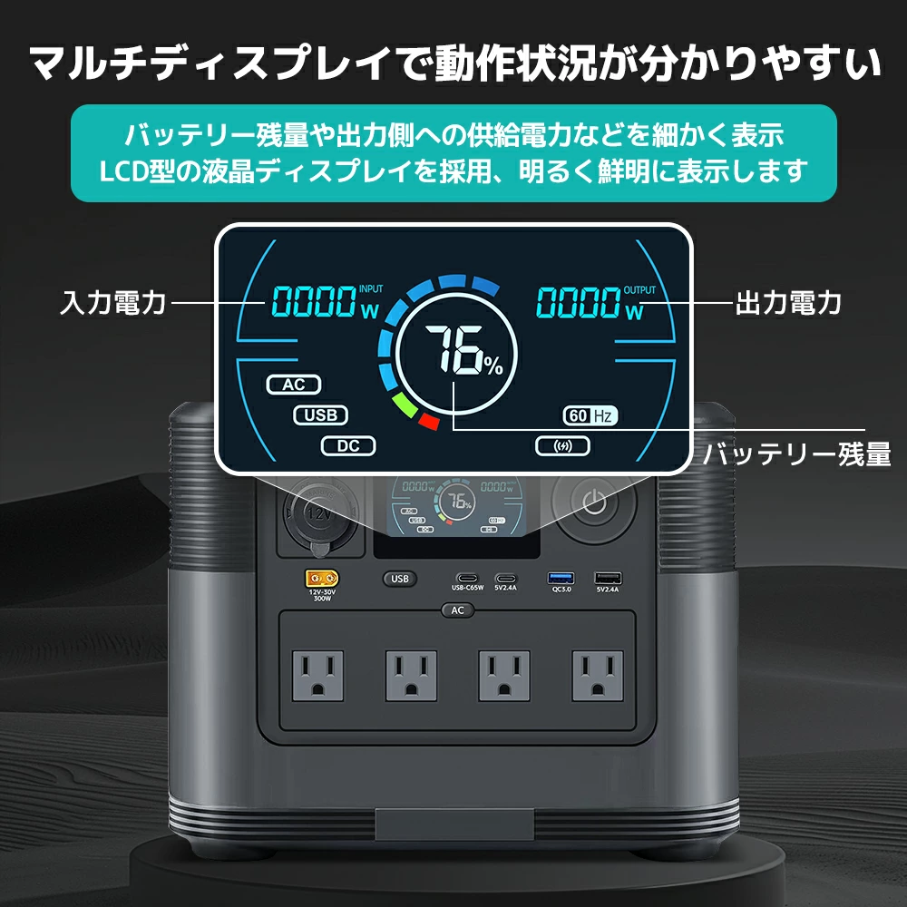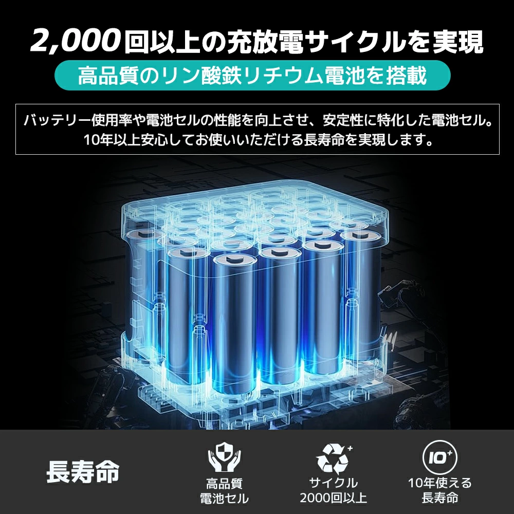 | 細部までこだわった、妥協のない品質追求! | 1:LEDライト:ランタンやSOS用フラッシュとして使用可能なLEDライト搭載。 2:大画面液晶ディスプレイ :一目瞭然で分かる大画面液晶ディスプレイを搭載しています。周波数/電量表示%/ 充電效率表示や、様々な情報を確認できます。 3:高級なアルミニウム合金の外殻で、内部には大型のファンが内蔵されており、優れた冷却性能を持っています。 4:取っ手が付いており、持ち運びに便利な高級でコンパクトなデザインです。 | 高寿命のリン酸鉄リチウムイオン電池の採用 | リョクエン ポータブル電源は高寿命のリン酸鉄リチウムイオン電池 (LiFePO4)を搭載しており、熱分解温度が高く、熱安定性が非常に優れています。サイクル寿命は2000以上で、一般的な電池より使用寿命が長くて、環境にやさしいです。また、液晶画面を搭載し、入力/出力電力値だけではなく、電池残量や接続の状況も確認でき、ポータブル電源を使うことがない初心者でもわかります。最新のバッテリー管理システム(BMS)により、過充電、過放電、過電流、過電圧、過熱、短絡を防ぎます。 |