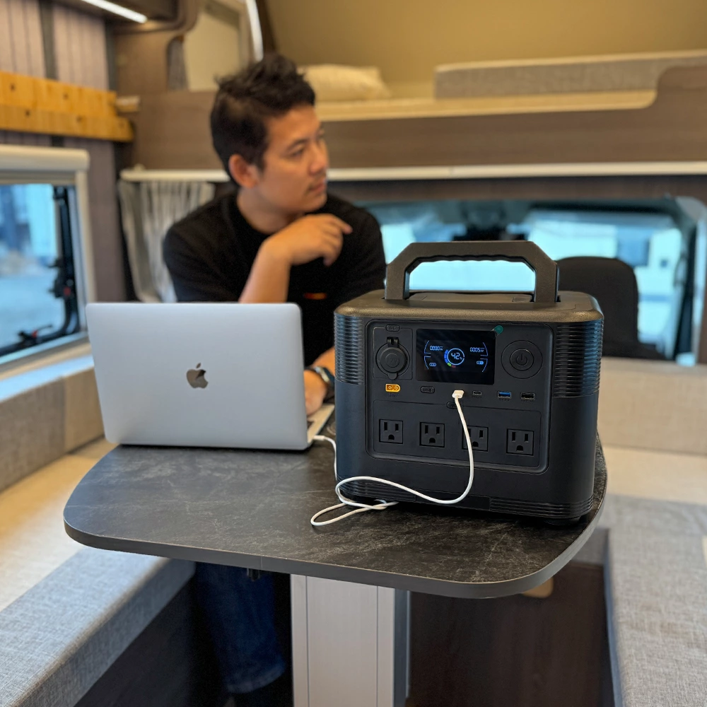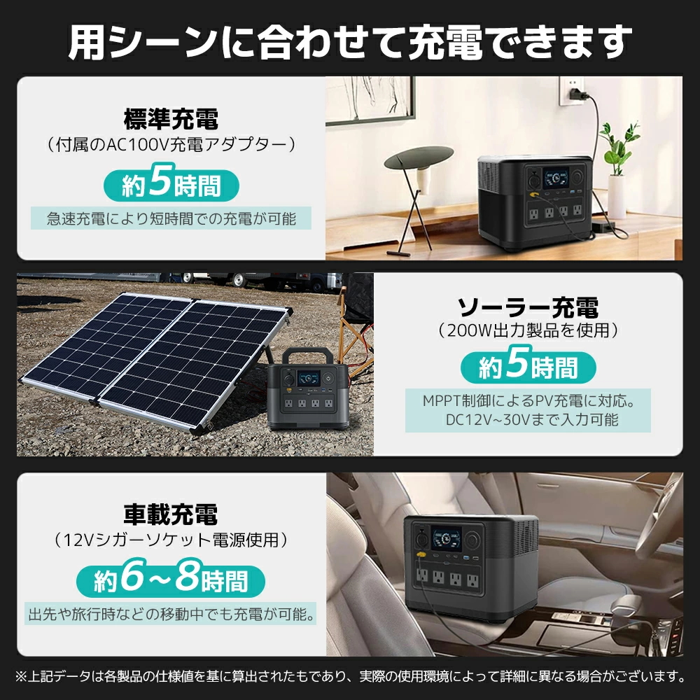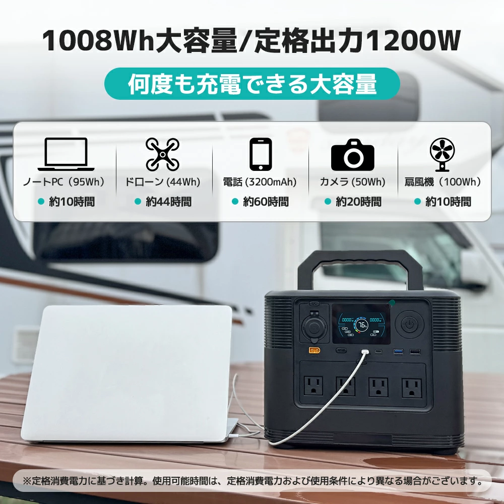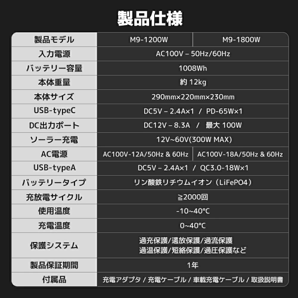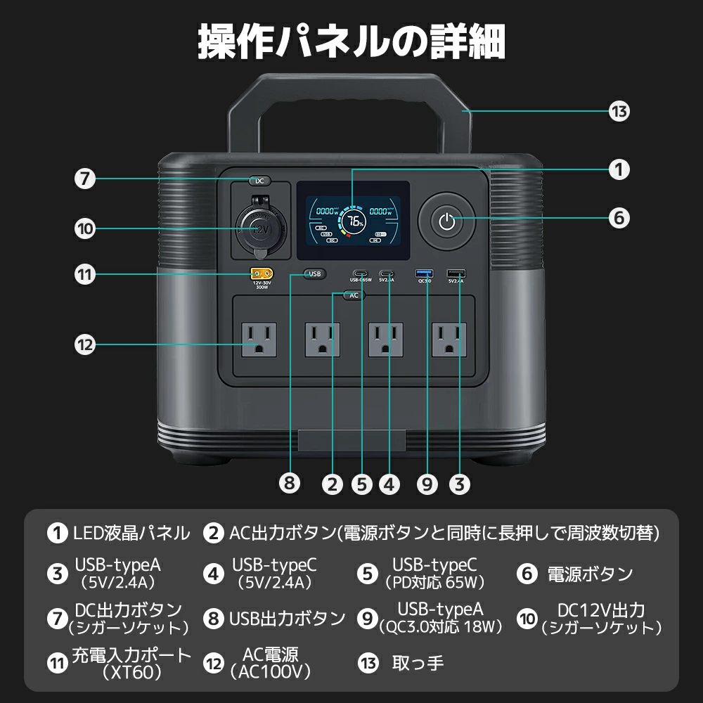 | 細部までこだわった、妥協のない品質追求! | 1:LEDライト:ランタンやSOS用フラッシュとして使用可能なLEDライト搭載。 2:大画面液晶ディスプレイ :一目瞭然で分かる大画面液晶ディスプレイを搭載しています。周波数/電量表示%/ 充電效率表示や、様々な情報を確認できます。 3:高級なアルミニウム合金の外殻で、内部には大型のファンが内蔵されており、優れた冷却性能を持っています。 4:取っ手が付いており、持ち運びに便利な高級でコンパクトなデザインです。 | 高寿命のリン酸鉄リチウムイオン電池の採用 | リョクエン ポータブル電源は高寿命のリン酸鉄リチウムイオン電池 (LiFePO4)を搭載しており、熱分解温度が高く、熱安定性が非常に優れています。サイクル寿命は2000以上で、一般的な電池より使用寿命が長くて、環境にやさしいです。また、液晶画面を搭載し、入力/出力電力値だけではなく、電池残量や接続の状況も確認でき、ポータブル電源を使うことがない初心者でもわかります。最新のバッテリー管理システム(BMS)により、過充電、過放電、過電流、過電圧、過熱、短絡を防ぎます。 |