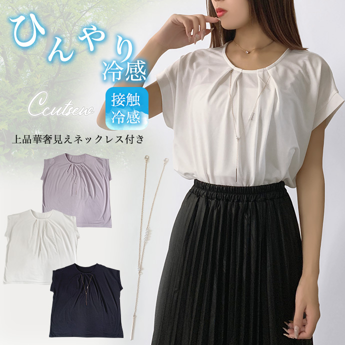 | 接触冷感加工 取り外し可能なネックレス付き クルーネック フレンチスリーブ ホワイトのみ透け感あり ポケットなし 無地 伸縮性あり フロントにタック入りデザイン |