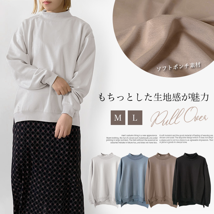 | もっちりとした柔らかな生地感 モックネック ポケットなし スリット入り ゆったりシルエット ネック周り、袖口、裾はリブ仕様 伸縮性あり 若干透け感あり |
