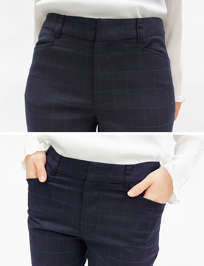 | 前:両サイドポケットあり ウエスト:ジップとフックとボタンあり 後:ポケット2つあり 伸縮性あり 透け感なし |