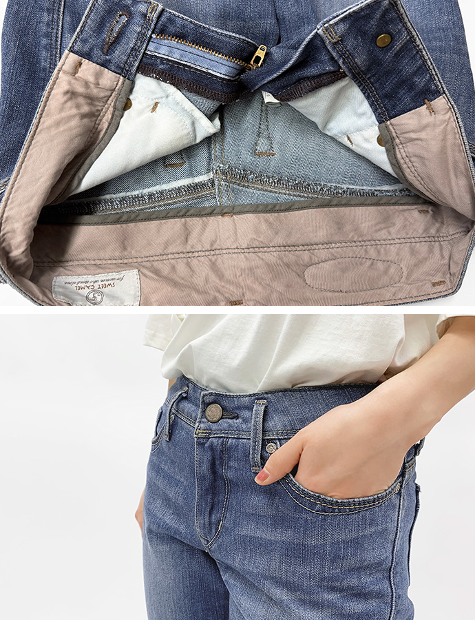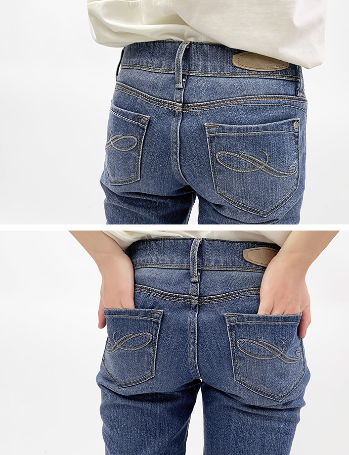 | 小さめなサイズ感 やや伸縮性あり 股上浅い ベルトループあり フロントファスナーあり 両サイドとバックにポケットあり |