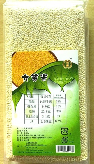 中国北方の代表的な雑穀です。お粥や中華点心の人気材料♪ 商品名:大黄米(キビ) 原材料:大黄米(キビ) 内容量:400 グラム原産国:中国 賞味期限:袋に記載 直射日光・高温多湿を避け、密封して暗所に保管してください。
