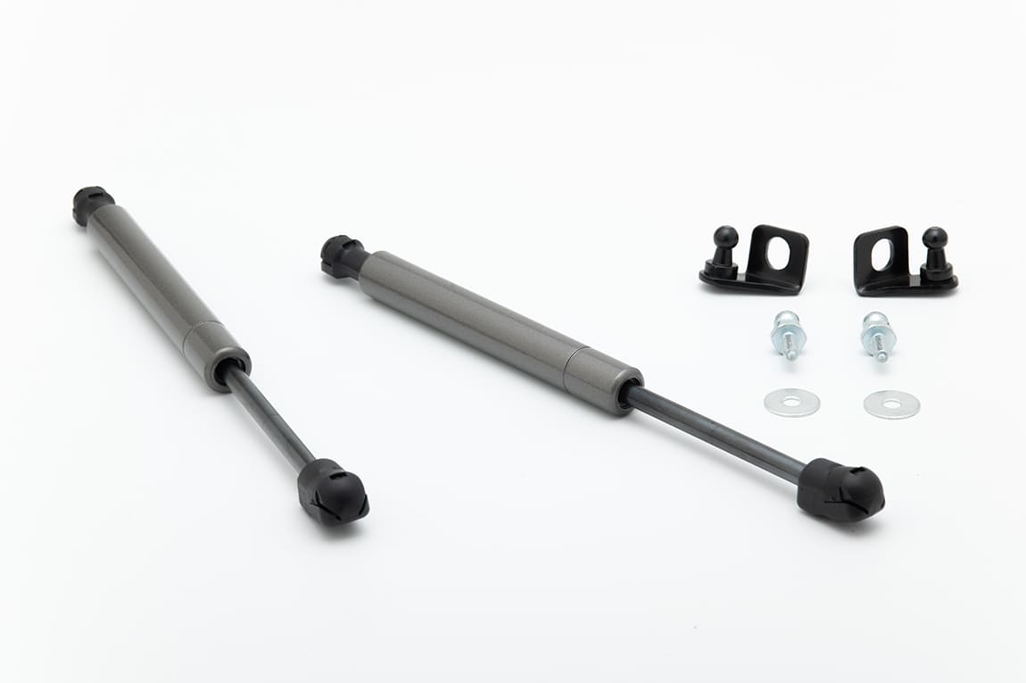 | 油圧により開放は楽々。ボンネットステーのように邪魔にならず、日頃のメンテナンスもはかどります。 ボンネットを約20cm以上持ち上げるとダンパーが効きはじめスムーズにオープン。 取り付けは完全ボルトオン。穴あけ加工など一切必要ありません。 取付ステーなど付属品一式付き。 本体色はブラックもあり、こちらはガンメタの商品となります。 | ||