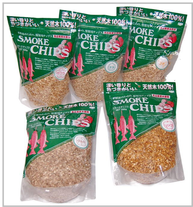 〜種類〜●サクラ・・・一番一般的で、香りは強いので豚肉やマトンなどくせのある素材に適しています。●ナラ ・・・煙にあまりくせはありませんが、色つきはかなり濃い方なので魚に使用するときれいな色に仕上がります。●オニグルミ・・・くせはなく肉類や魚類に広く使用できます。●リンゴ ・・・香りはかなりやわらかく、くせのない鶏肉や白身魚などに合います。●ヒッコリー・・・北米では一番幅広く利用されていて、ベーコンやハム、スモークサーモンには最適です。●ブナ・・・ナラと同様に色つきがいいので魚に合います。ヨーロッパではハムやソーセージなど肉類にも多く使われています。●ヒッコリー・・・北米では一番幅広く利用されていて、ベーコンやハム、スモークサーモンには最適です。●ホワイトオーク・・・ウィスキー樽に長年使われたナラ材で、とてもいい香りがします。ウィスキーの香りを生かしたいので淡泊な素材(鶏肉や白身の魚)にご使用下さい。※ご注意!一部市販されているスモークチップの中にはヒッコリーと表示して あるのに“(オニグルミの木)”となっている商品があります。ヒッコリーとオ ニグルミは同じクルミ科ですが、オニグルミはクルミ属でヒッコリーはペカン属で すので、全く別種です。材質も全く異なりますので購入の際は注意が必要です。