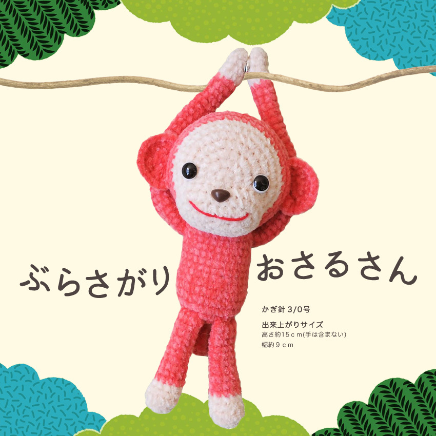 あみぐるみが編みたくなる糸で編むあみぐるみ、「ぶらさがりおさるさん」の編み図です。