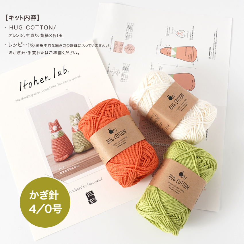 ■セット内容…HUG COTTON/オレンジ、生成り、黄緑×各1玉、レシピ…1枚(※基本的な編み方の解説は入っていません。)