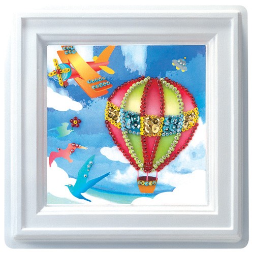 気球、飛行機、鳥にUFOに男の子が大好きな空飛ぶ仲間が描かれたプッシュボードの下絵にそってビーズやスパングルをピンでさしていきます。