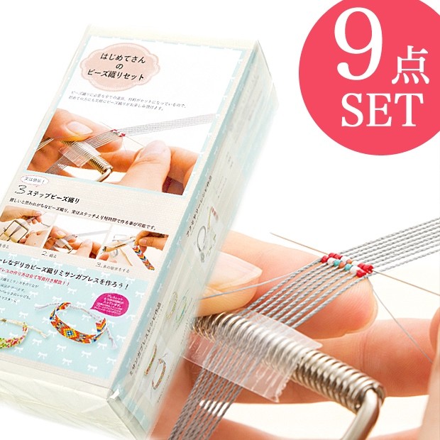 【 セット内容 】 ビーズおりき(H907)、ビーズ針(K2377(0.4×55mm)、デリカビーズ(11色)、ワイヤー、ミサンガ用ブレスパーツ(ゴールド、シルバー)、たて糸(アイボリー、グレー各15m)、よこ糸(20m)、ビーズマット、説明書・アクセサリーレシピ