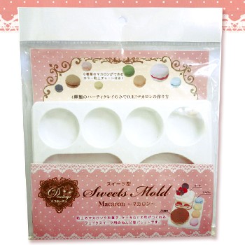 粘土のマカロンや和菓子、ケーキなどの形が作れるフェイクスイーツ用のねんど型パレットです。大人気のマカロンが同時に4つ作れます。大きな丸は、ホールケーキやどら焼、ホットケーキなどの型に、四角は、ショートケーキなどの型として使えます。8種類のマカロンができるカラー粘土チャート付き。