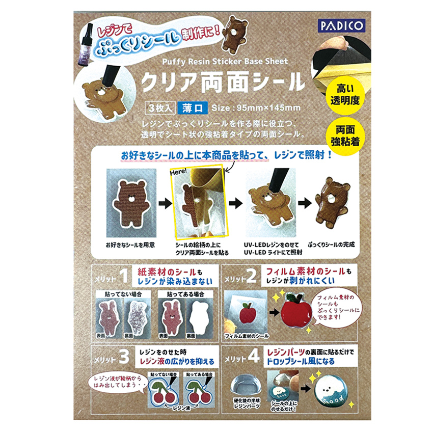 レジンでぷっくりシールを作る際に役立つ、透明でシート状の強粘着タイプの両面シールです。