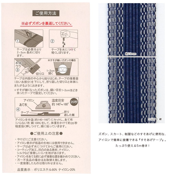 ズボン、スカート、制服などのすそあげに便利な、アイロンで簡単に接着できる『すそあげテープ』。