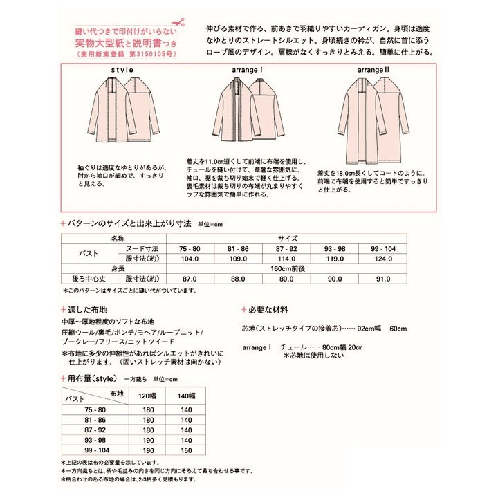 縫い代つきで印付けがいらない実物大型紙と説明書つき「ローブドカーディガン」のパターンです。