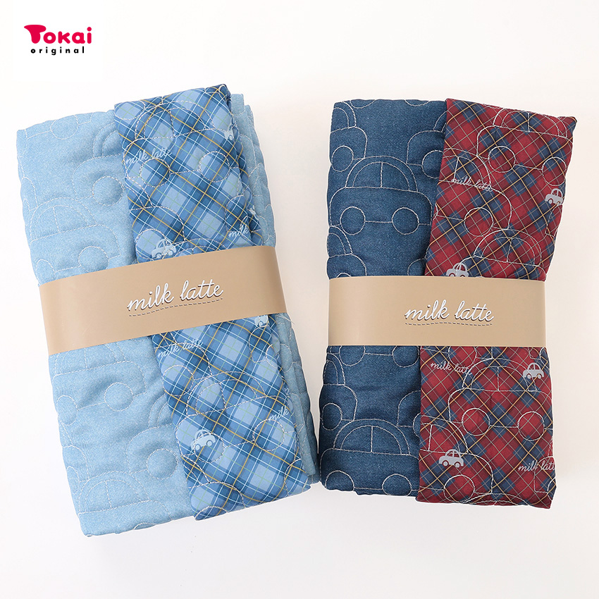 裏側はチェック柄に自動車モチーフ×ブランドロゴがプリントされ、リバーシブルで使えます。