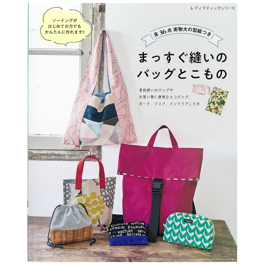 ソーイング初心者でもかんたんに作れるまっすぐ縫いのバッグと小物の本。バッグやリュック、エコバッグ、きんちゃくやポーチ、マスク、クッションカバーなど、豊富なアイテムを掲載。すべて作り方つき。実物大の型紙つき。