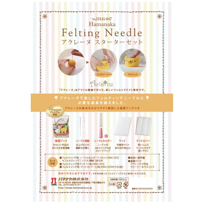 【 セット内容 】 フェルティング用ニードル極細(1本タイプ)×2本※ニードルホルダーにセットされています、フェルティング用ニードルホルダー…1個、フェルティング用マット…1枚、フェルティング用マットカバー…2枚、基礎ブック(アクレーヌで作るクリーナー&マスコット)