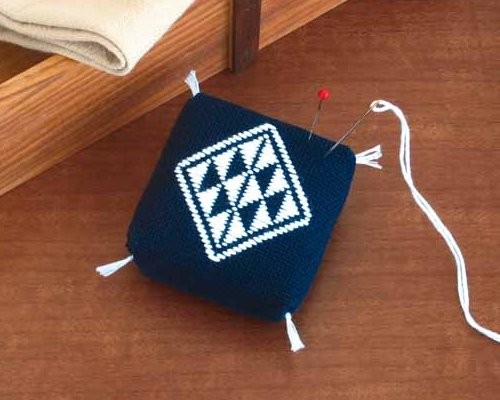 日本の伝統刺繍こぎんで作るピンクッションです。美しい幾何学模様をお楽しみください。はじめての方にも気軽に始められます。