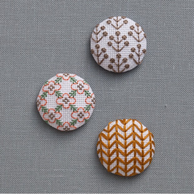 はじめての方にちょうど良い小さな包みボタンのキット。3〜4種類の地刺しが習得出来ます。ブローチやヘアゴムにアレンジしてお楽しみください。