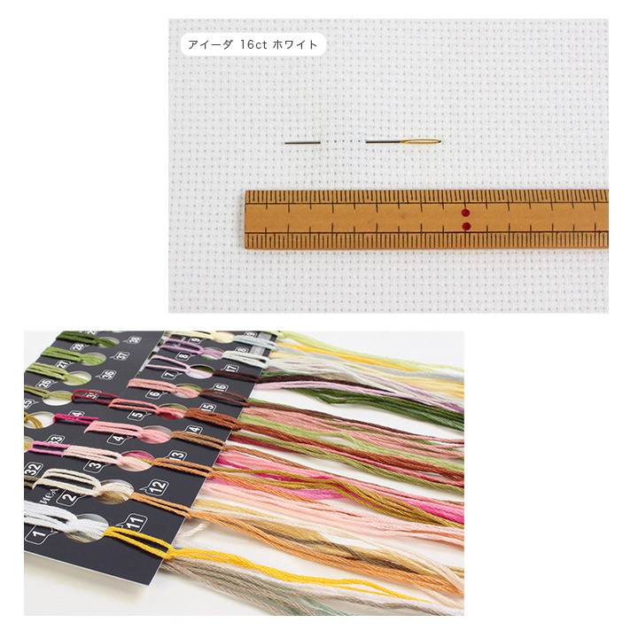【 セット内容 】 刺しゅう布、刺しゅう糸(色分け済み)、針、カラー図案、簡易説明書