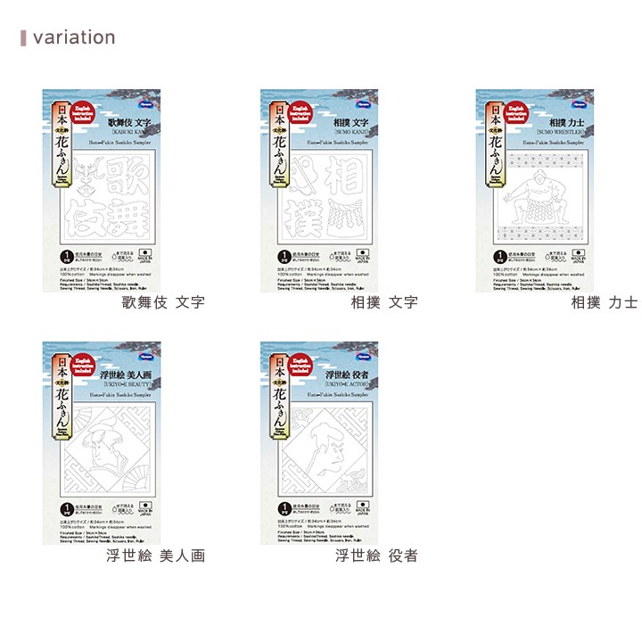日本の文化を代表する「歌舞伎 文字 KABUKI KANJI」「相撲 文字 SUMO KANJI」「相撲 力士 SUMO WRESTLER」「浮世絵 美人画 UKIYO-E BEAUTY」「浮世絵 役者 UKIYO-E ACTOR」の全部で5種類が花ふきんになりました。