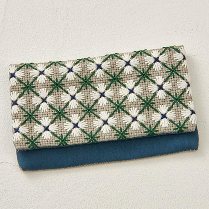 刺繍 地刺しキット カードケース 菱格子の白い花|コスモ ルシアン 戸塚刺繍 No.2325