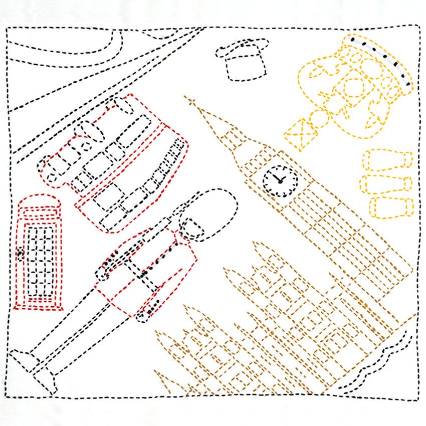 刺し子キット 花ふきん SASHIKO WORLD England 2階建てバスに乗って KSW-027 | 手縫いの花ふきんキット 刺し子 ワールド イングランド イギリス 刺繍キット