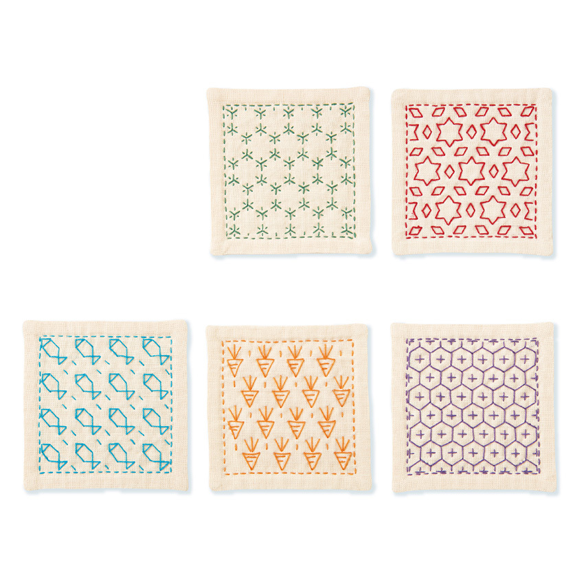 オリムパス 一目刺しのコースター キット 生成 5枚1組 SK-422 /角亀甲つなぎ/星と三つ菱/サカナ/ニンジン/十字亀甲 | 一目刺し 刺し子キット
