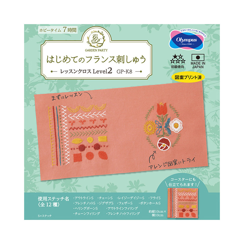 GARDEN PARTY はじめてのフランス刺しゅう 第2弾 レッスンクロスLevel2 GP-K8 キット | フランス刺繍 初心者 ステッチ練習 コースターが2枚作れる レベル2