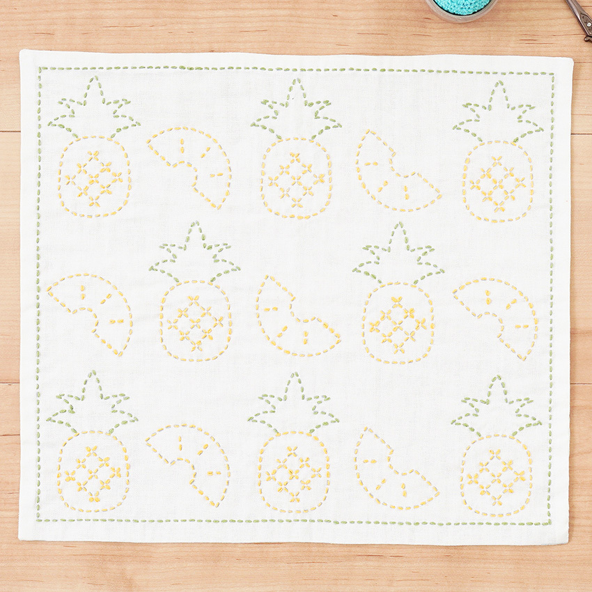 刺し子キット ふきん 白 <パイナップル> 3541UV10314-4 日本製 約30×34cm | 刺し子のふきん 花ふきん キット 水で消える図案 かんたん 初心者 原ウール