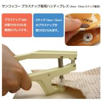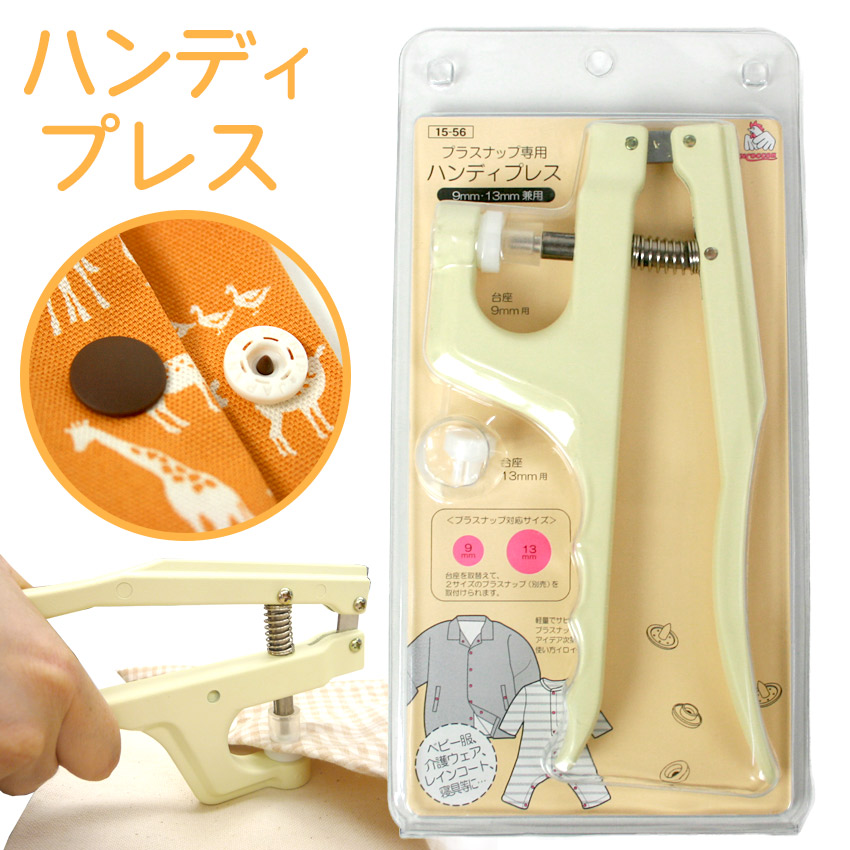 | 特徴 | ■プラスナップ(別売り)を取り付けられる、専用ハンディプレスです。 ■付属の台座を取り替えると、2サイズ(9mm・13mm)のプラスナップが取り付けられます。 ■取り付けできる生地の厚みは、生地を圧縮した状態で、9mmスナップ…約0.8mmまで、13mmスナップ…約1.5mmまでです。 台座やクッションはついていますが、プラスナップは付いていませんので別途に購入してください。 プラスナップは… ・プラスチックだから、軽くて錆びない! ・金属アレルギーの方にもやさしい。 ・軽い力で開閉できます。 ・取付けが簡単です。 ベビー服、キッズのお洋服はもちろん、介護ウエア、レインコートやアウトドア用品、寝具など、幅広い用途に使えます。 バスタオルに取り付ければ、ラップタオルの出来上がり。 ダブルガーゼの生地やハンカチに取り付ければ、かんたんスタイが完成! お名前タグ作りにも活用できます。 針や糸がなくても簡単に取り付け可能で、製品のようにきれいな仕上がりです。一つあるととっても便利! |