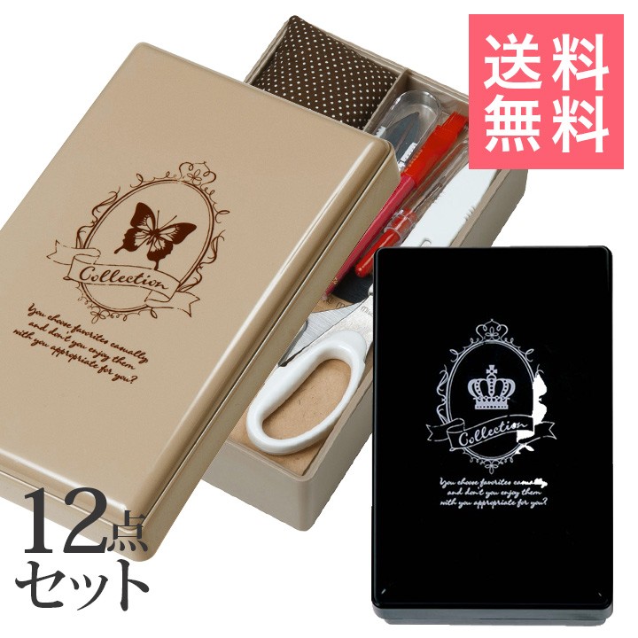 ケースにはベージュは蝶、ブラックはクラウンがデザインされた、シンプルでシックなソーイングセット。