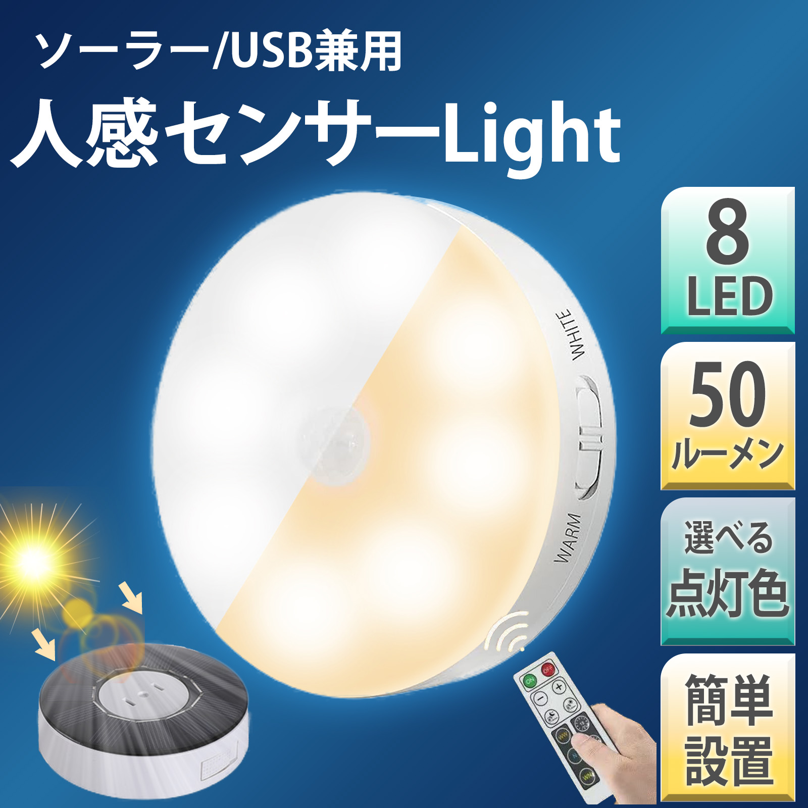人感センサーライト 2個セット 室内 玄関 ソーラー充電 USB充電 兼用 LED 明暗センサー リモコン 照明 クローゼット 屋内 廊下 小型 防災グッズ 8LED A103