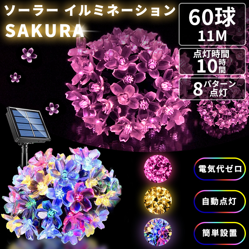 イルミネーションライト サクラ ソーラーライト 屋外 60LED 11m 8パターン点灯 桜 さくら 花 花びら 防水 60球 クリスマス ハロウィン 車内 A058