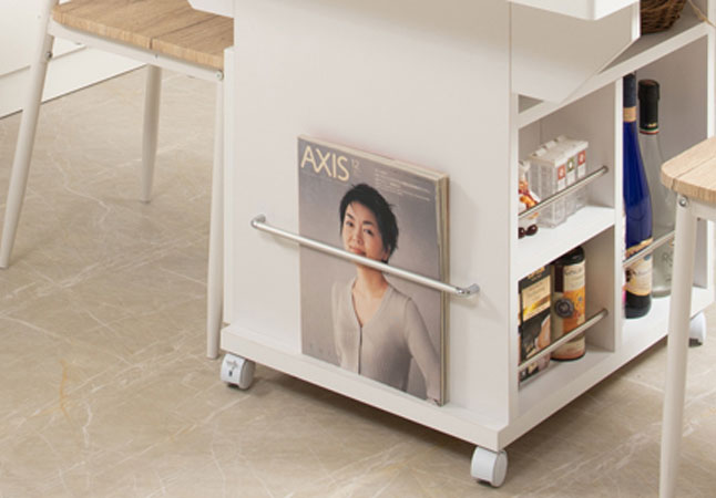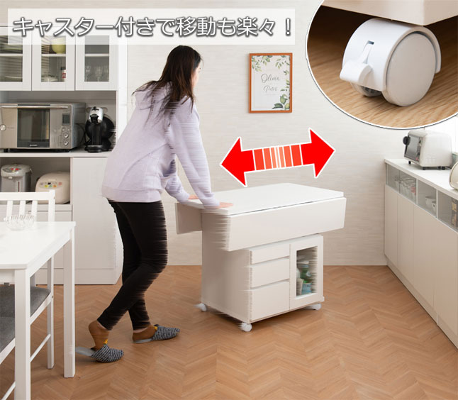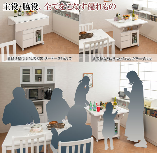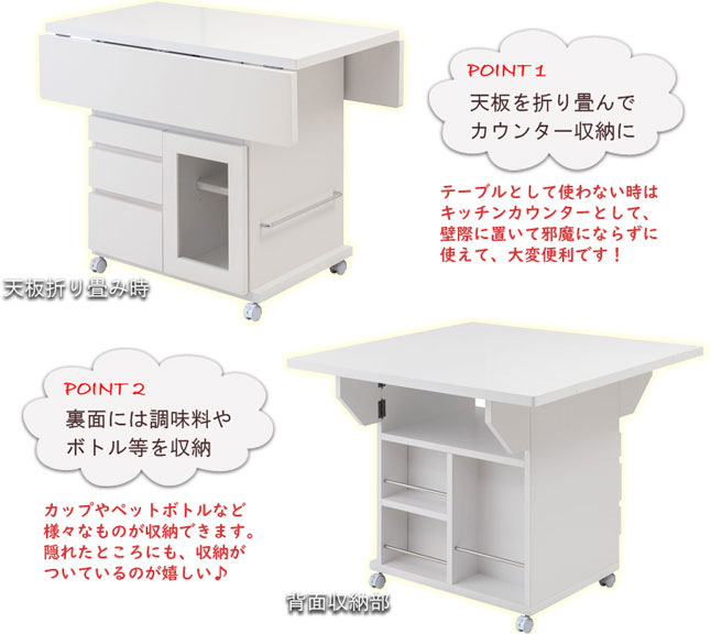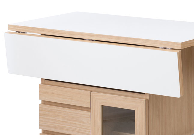 天板は両サイドを折り畳むことができますので、テーブルとして使用しない時は折り畳んでキッチンカウンターとしてもご使用いただけます。