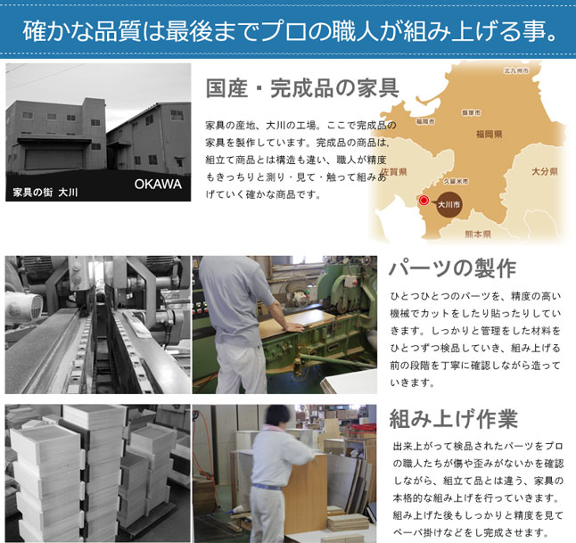 家具の本場である九州の大川市で製造され、完成品としてお届けいたしますので、届いてすぐにご使用いただけます。