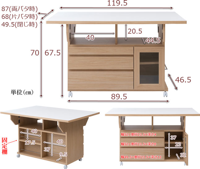 バタフライテーブル キャスター付き 収納付き 幅119.5cm 天板折り畳み式 木製 日本製 完成品 キッチンカウンター キッチンワゴン カウンター収納