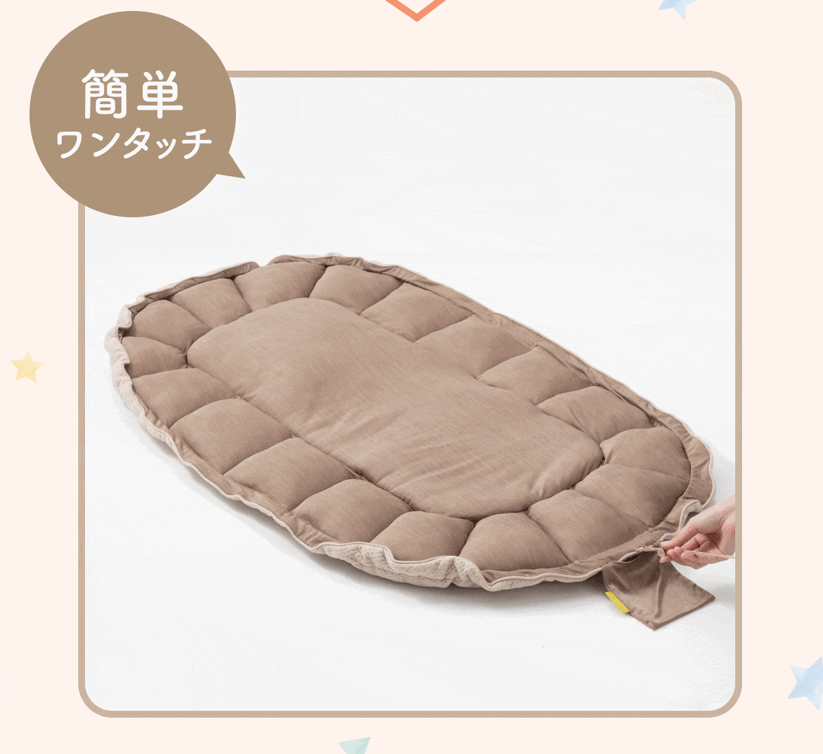 軽量設計で移動もラクラク。寝室やリビングへの持ち運びはもちろん、里帰り出産や旅行先、実家への帰省など外出時にも便利に使えます。赤ちゃんは慣れた環境で安心できるため、どこでもお気に入りの居場所を作ってあげられるのが大きな魅力です。