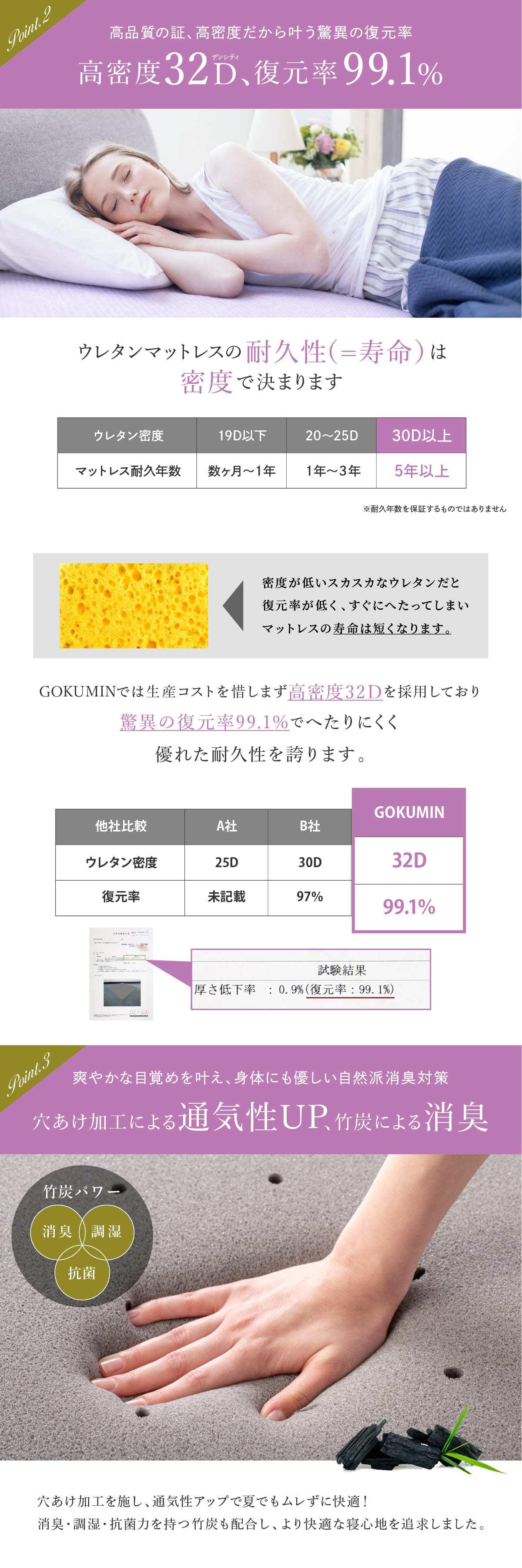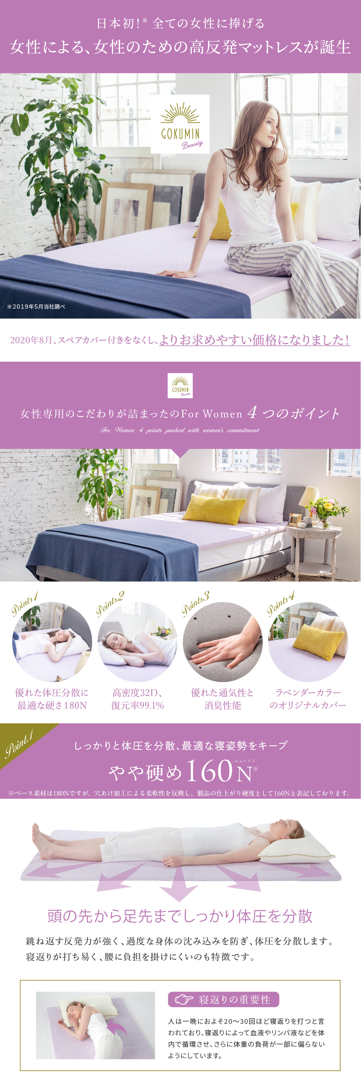 【日本初!女性のための寝心地】女性にむけた最高の寝心地を実現するやや硬め160N(※ベース素材は180Nですが、穴あけ加工による柔軟性を反映し、製品の仕上がり硬度として160Nと表記しております。)の新開発高反発素材。こだわりの高密度(32D)素材による最高の質感と高耐久性(国内検査済み)。安心して極上の寝心地を得られます。