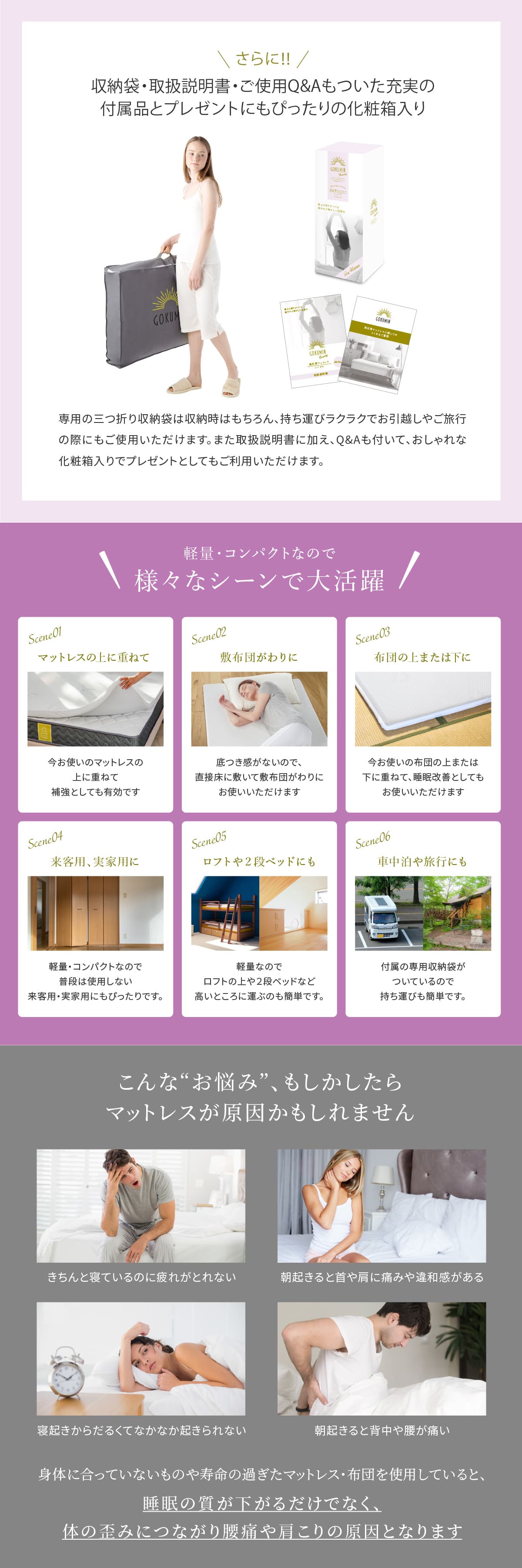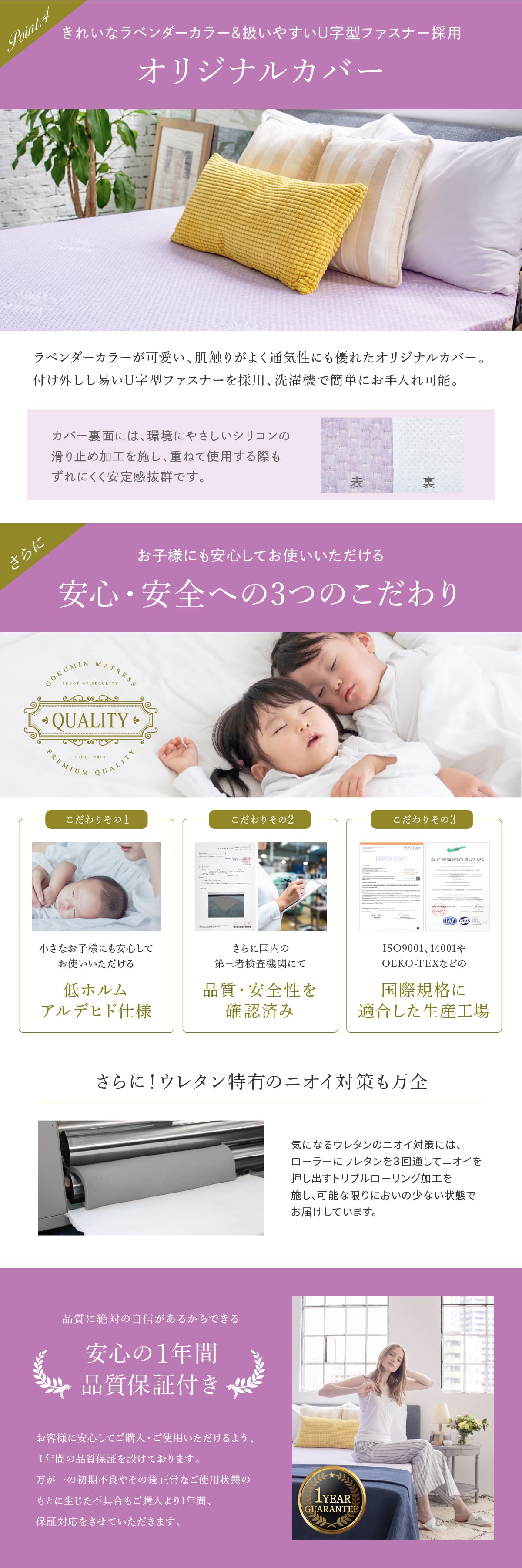 【豪華!極上高級マットレスカバー】 肌触りがよく、通気性にも優れたラベンダーカラーのオリジナルカバー。もちろん毎日使うものだから、GOKUMINは専用設計の抗菌・防臭・低ホルムアルデヒドです。