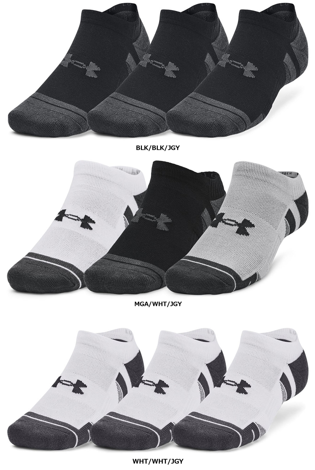 アンダーアーマー UNDER ARMOUR UAパフォーマンステック ノーショー ソックス 3足セット メンズ レディース 靴下 くつした ショート丈 スポーツソックス ランニング 防臭 通気性 速乾 1379503 ノーショウ(靴からやや見える丈)。防臭加工でソックスの臭いを防止。速乾性に優れた素材で汗をすばやく発散。アーチサポートで足裏の負担を軽減。メッシュパネルで通気性を強化。