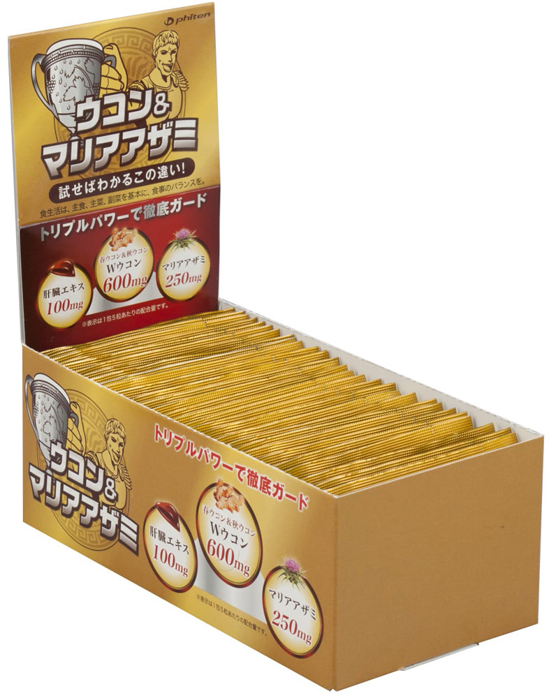 ファイテン Phiten ウコン&マリアアザミ 30包 ウコン 個包装 肝臓エキス サプリ 健康食品 携帯 持ち運び クルクミン 秋ウコン 春ウコン 飲み会 お酒 GS558000 飲み過ぎた次の日、仕事が手に付かないといった経験ありませんか。[ウコン]には、クルクミンを多く含む秋ウコン、ミネラルや精油成分を多く含む春ウコンなどをはじめ、肝臓エキスやマリアアザミ、ウコンエキスなどをバランスよく配合。会社の飲み会や、付き合いでお酒を頻繁に飲まれる方におすすめします。