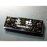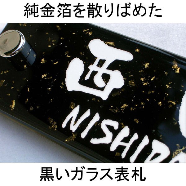 | 黒ガラスとクリアガラスの間に純金箔を溶かし込みました。 煌びやかな金箔を背景の黒が引き締め、落ち着きのある個性的な表札に仕上げました。 縁起の良い事に使用される金箔は、表札にもピッタリです。 文字は、釉薬を釜で焼成し色付けする、半永久的に落ちない着色です。 文字着色はホワイトのみです。 この表札は、素材の見映えを生かす為に、文字のみの彫刻となります。 字体の変更は可能です。 背部にステンレス背板が付いているので、 取り付け簡単、超強力両面テープ付き。 戸建て、機能門柱にも表札サイズの平らなスペースがあれば設置可能です。 [サイズ] 背板ステンレス 50x150mm ガラス 約50x150mm ガラス厚み 約6mm [取付け方法] 超強力両面テープ付き貼付けタイプ [彫刻面仕上げ] ホワイト着色 [完成予定] デザイン決定及びご入金確認から約14営業日 [仕様] 工房オリジナル [備考] オーダーサイズも可能です。 マンションの表札取付け部の規格は様々です。 汎用サイズとして作製していますが、別途マンションのサイズに合わせた特注オーダーも可能です。 オーダーサイズ価格表 ガラスと背板のサイズを変えるなど、特殊な場合は、 ご希望サイズを明記の上、お問合せ下さい。 別途お見積もり致します。 ガラスサイズ変更なし+ステンレス背板サイズ変更 2,000円(税別)UPから 仕様などにより価格が変りますので、詳細はお問合せ下さい。 オーダーサイズ注文時のご注意 ・オーダーサイズの為、発注後のキャンセルはできません。 ・素材から作製しますので、通常より作製日数がかかります。(約14営業日) ・ご注文は商品ご購入フォームの備考欄にサイズをご記入下さい。 ご覧のモニター設定の違いにより、色の見え方が実際の商品と異なることがございます。 デザインの打合せはご注文後に行います。 良くあるご質問は、マンション表札Q&A をご覧下さい。 |