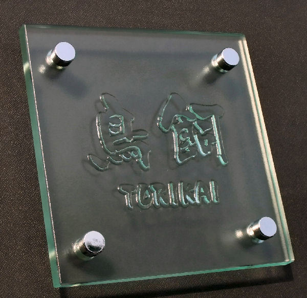 10mm厚のガラスから、文字のみを立体的に彫りおこしました。色付け等を行わず、ガラス自体で文字を表現しました。