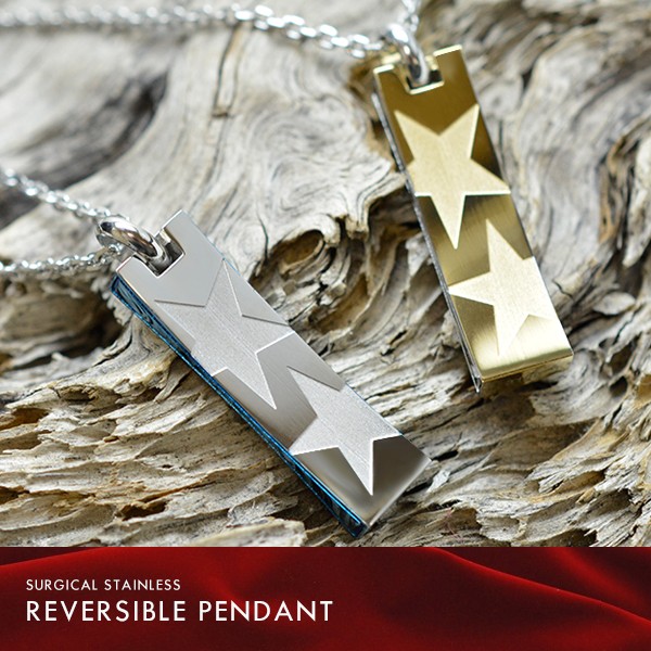 このペンダントの特徴は星型を2個型押した片面と、プレーンな鏡面の片面のリバーシブル。