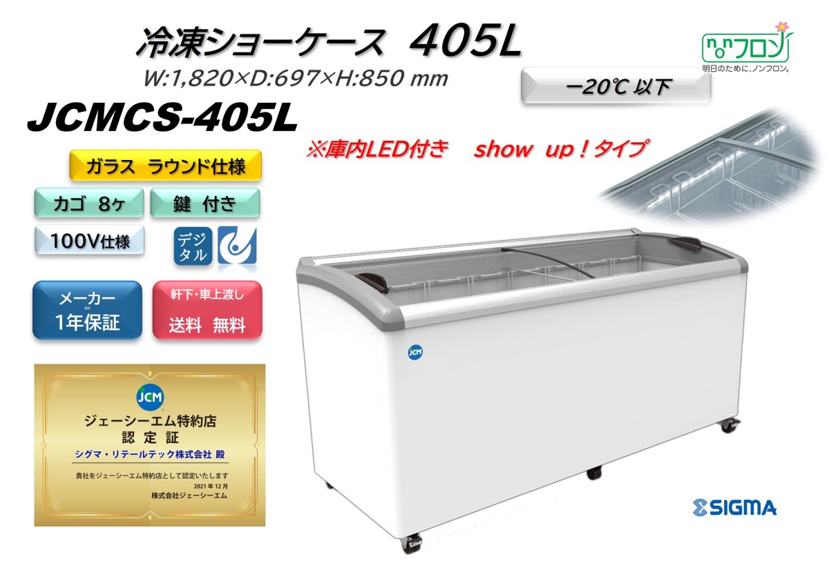 JCMCS-405L 冷凍ショーケース LED搭載 ラウンドタイプ 庫内カゴ8個搭載 冷凍庫 軒先車上渡しは送料無料 プライスホルダー付