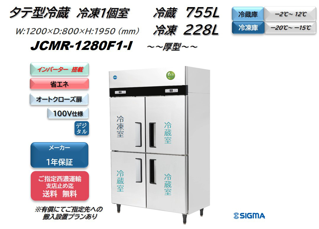 インバーター制御搭載モデル/業務用 JCMR-1280F1-I 省エネ タテ型冷蔵3・冷凍1 厚型 100V仕様