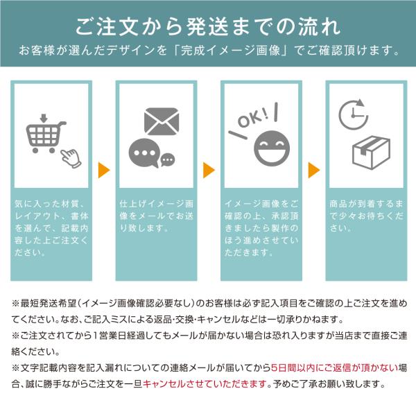 | 注意事項 | 1、この商品は受注生産品のためデザイン確認後のご返品、交換、キャンセルなどは一切お受付いたしかねます。 2、ご注文されてから2営業日以内、当店から連絡メールはお客様の登録したメールアドレスにお送りいたします。 なお、2営業日経過してもメールが届かない場合は恐れ入りますが当店まで直接ご連絡してください。 3、最初の連絡メールが届いてから5日間以内に返信が頂かない場合、勝手ながらご注文を一旦キャンセルさせていただきます。(クーポンなどは使用済み扱いいたします) 4、取り付けによる、怪我・破損・汚損・紛失等については補償致し兼ねます。予めご了承下さい。 5、色の見え方につきましては、お客様のモニターなどの設定により、違って見える場合もございますので、予めご了承くださいませ。 6、発送について:こちらの商品は一部のサイズではメール便の発送になっております。メール便は、ポスト投函の為、お届け先ご住所が、間違いのないようにお願致します。住所不明で再送となった場合は、再送料300円を別途を振込み頂きます。 |