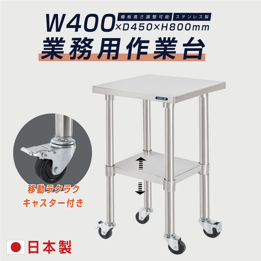 日本製 ステンレス 作業台 業務用 キャスター付き 調理台 W400mm×H800×D450mm ステンレス調理台 調理 厨房作業台 作業テーブル キッチン作業台 kot2ca-4045