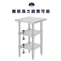 【製品仕様】本体サイズ:W45×H80×D60cm / 材質:天板:ステンレスSUS430 脚:ステンレスSUS201、梁:スチール アジャスト脚:ステンレスSUS201/PVC / 仕様:組立式 / 付属品:六角レンチ